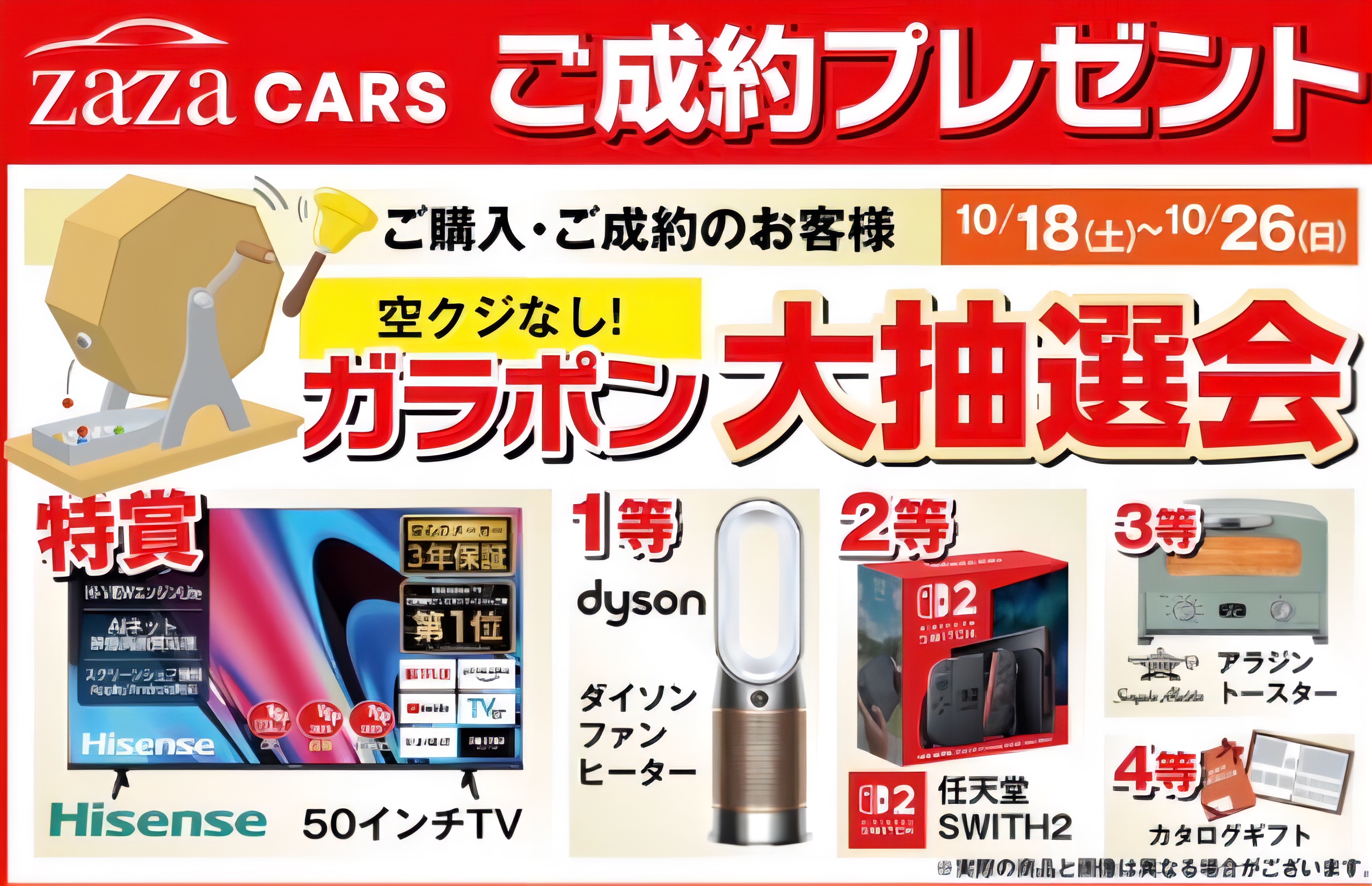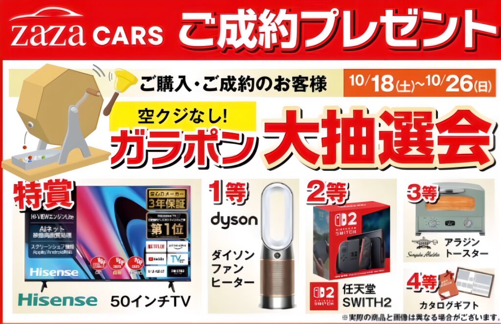 OPENキャンペーン② 2025年10月9日 最終更新日時 : 2025年10月31日 zazacars_admin 超豪華景品の大抽選会!10/18〜26の期間限定キャンペーンになります!ハズレなしの超豪華仕様!ご来店是非ともお待ちしております!