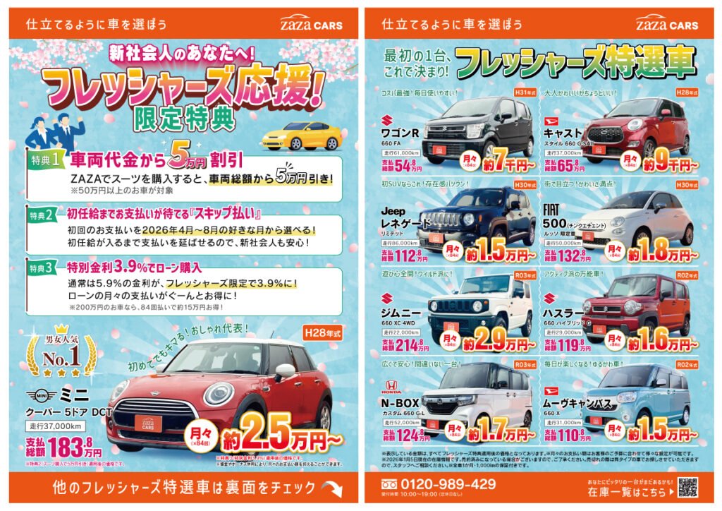 フレッシャーズ応援!限定特典 2026年1月23日 最終更新日時 : 2026年1月23日 zazacars_admin 【🌸新生活応援📣】フレッシャーズ限定!ザザカーズでお得にクルマ選び★特選車あり!画像をタップ👆 Screenshot